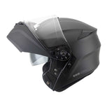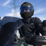 La visera exterior inclinable tiene un sistema de liberación rápida y se bloquea en la posición cerrada, y es compatible con Pinlock 70. Además, la visera solar interior retráctil permite al conductor adaptarse a las diferentes condiciones de luz. El interior está hecho de tela termoformada hexagonal Extracool, que ofrece una comodidad superior y un compartimento especial para patillas de vidrio. El sistema de intercomunicación incluye un espacio dedicado para los auriculares y el soporte del micrófono. La hebilla micrométrica y el tope de la correa elástica tricolor completan las características premium de este casco de alta gama.