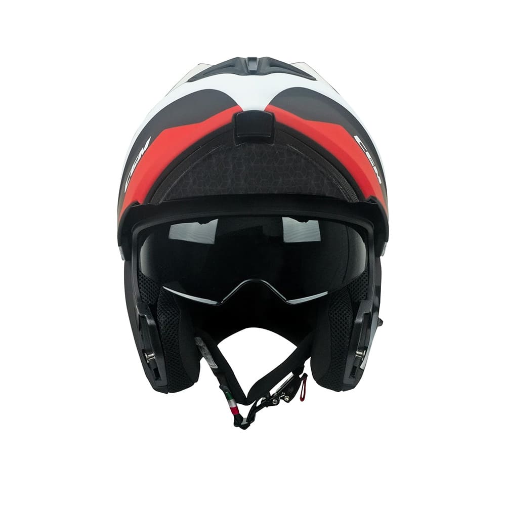 La visera exterior inclinable viene con un sistema de liberación rápida y se bloquea de forma segura en su lugar, y es compatible con Pinlock 70. La visera solar interior retráctil permite a los conductores adaptarse a diferentes condiciones de iluminación. En el interior, el casco presenta interiores termoformados hexagonales hechos de tela ExtraCool, con un compartimento especial para patillas de vidrio. El diseño del sistema de intercomunicación incluye espacio para el cuerpo del auricular y el soporte del micrófono. La hebilla micrométrica y el tope de la correa elástica tricolor completan el diseño premium del casco.