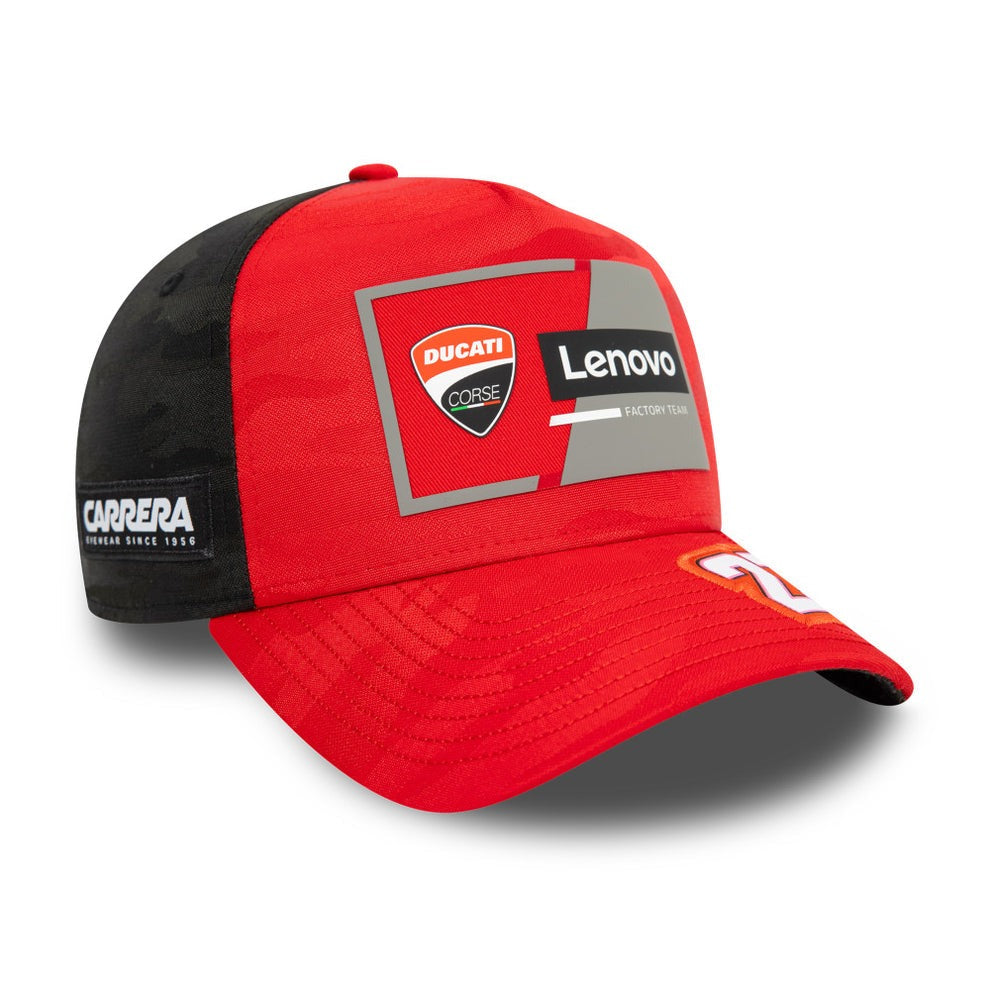 La gorra Ducati Team Camo Enea Bastianini 9FORTY E-Frame es una réplica de la gorra de piloto, con un diseño de camuflaje rojo en los paneles frontales y la visera. Incluye varios elementos de la marca: el logotipo de Ducati Motor con el logotipo de Lenovo en la parte frontal, el logotipo de la marca Ducati a la izquierda, el logotipo de Carrera a la derecha y el logotipo de Diadora en el arco trasero. El número de piloto de Enea Bastianini, el 23, se muestra en el lado izquierdo de la visera curva, y la visera inferior negra luce el logotipo de velocidad de Ducati bordado a la derecha. La correa de velcro incluye una etiqueta tejida de UnipolSai, mientras que la bandera de New Era está bordada en el lado izquierdo. Esta gorra E-Frame estructurada está hecha de 100 % poliéster para un ajuste cómodo y duradero.