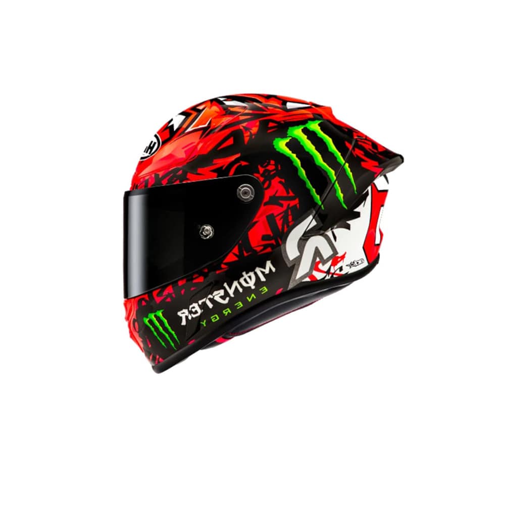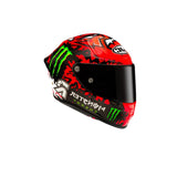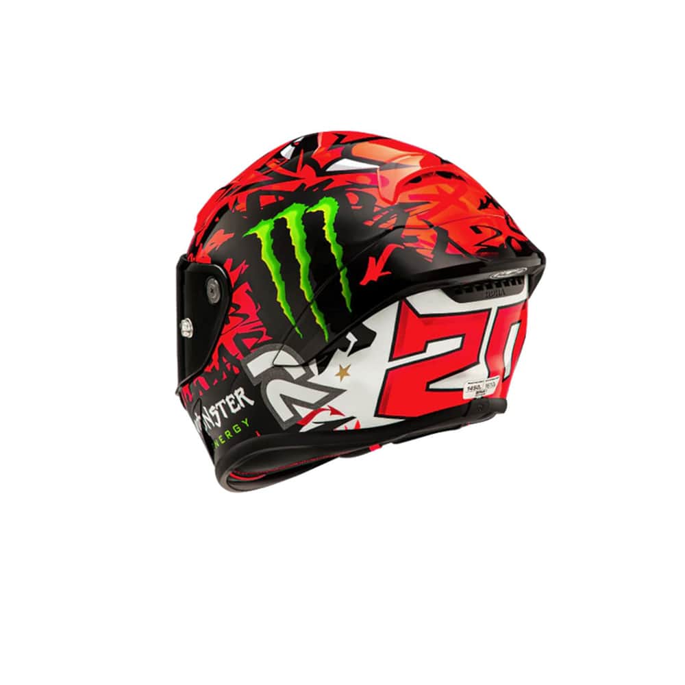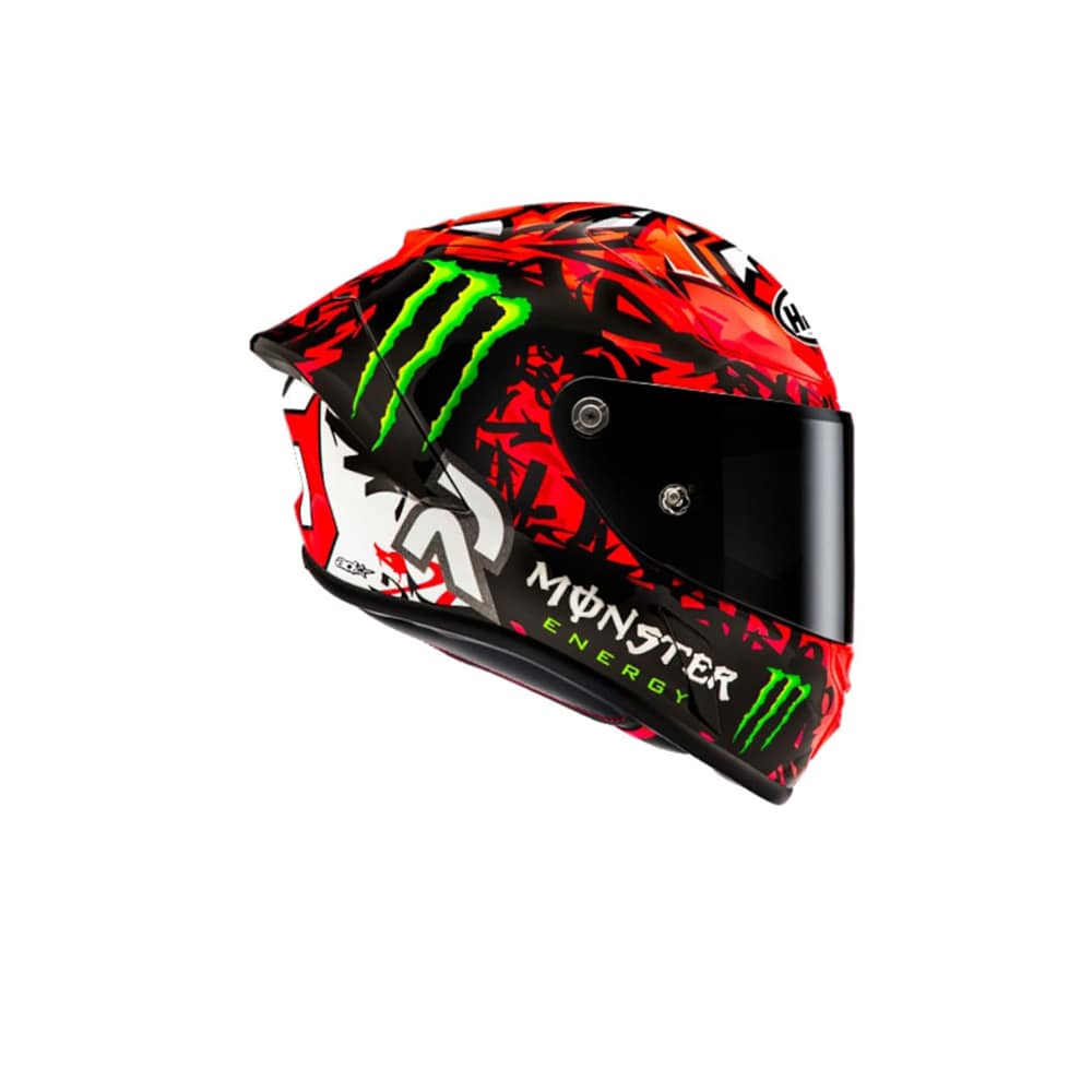 Con un aspecto agresivo, el casco se presenta en un elegante y brillante acabado rojo de carreras con un patrón único que enfatiza su potencia y velocidad. Fiel a su condición de réplica, el icónico logotipo de "EL Diablo" está estampado en la parte superior del casco, mientras que la marca Monster Energy adorna los laterales. Este casco combina estilo con rendimiento y muestra la simbiosis perfecta de estilo y rendimiento. El RPHA 1 fue desarrollado y diseñado después de varios años de esfuerzo concentrado y comentarios cruciales de los mejores atletas de MotoGP y WorldSBK. El RPHA 1 es el mismo modelo utilizado por los atletas de clase mundial de HJC tanto en MotoGP como en WorldSBK. La carcasa exterior consta de una Premium Integrated Matrix Plus (PIM+), una mezcla compuesta de fibra de carbono, aramida, fibra de vidrio y materiales orgánicos no tejidos.