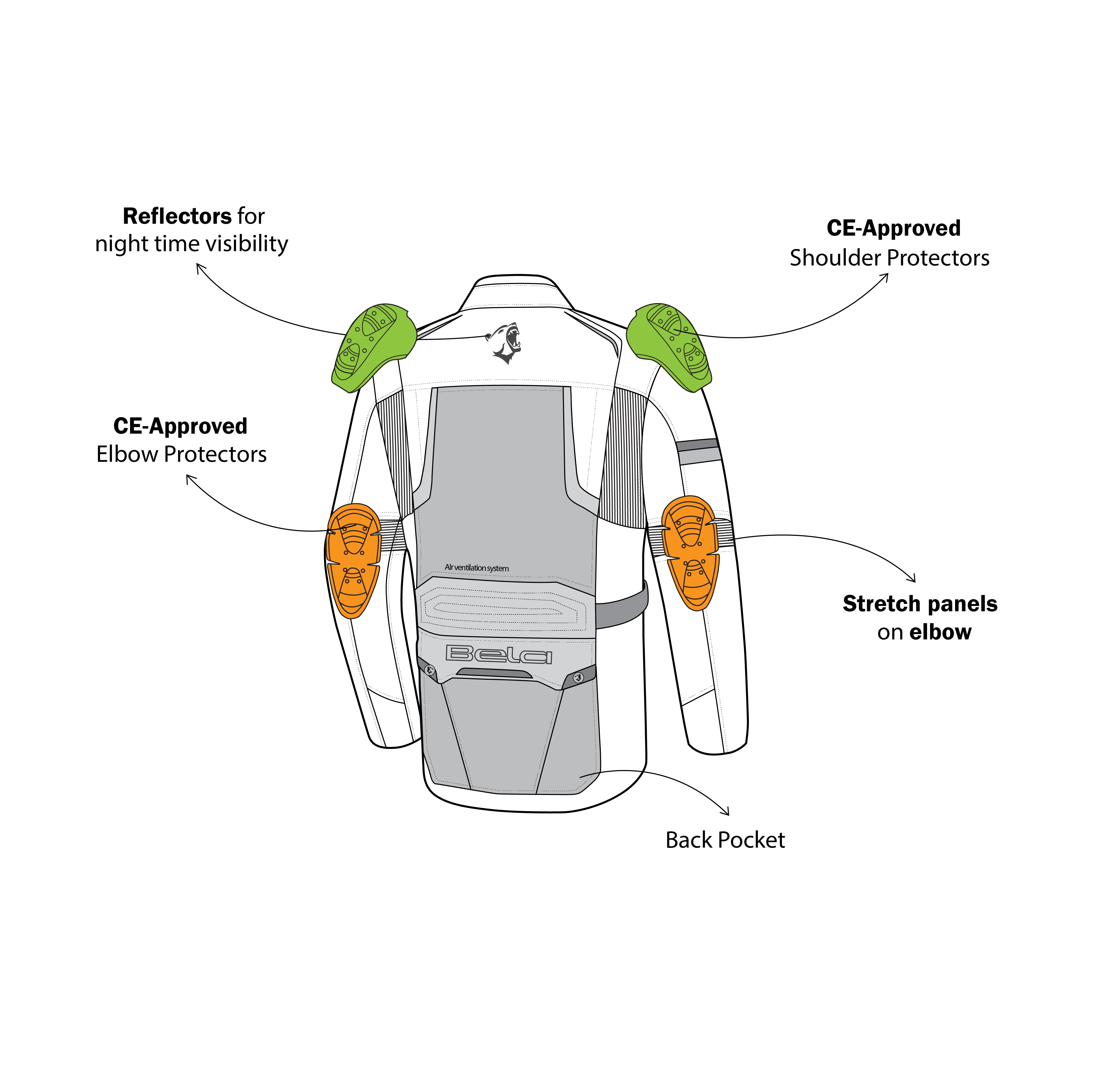 Velcro waist belt. Cuff adjustments. Adjustable straps on the forearms and biceps. Stretch panels on the elbows and shoulders for greater flexibility and freedom of movement. High Visibility in Low-Light Conditions Silver reflective panels on the chest, arms, and back increase your visibility in low-light conditions, making you safer when riding at night or on cloudy days.