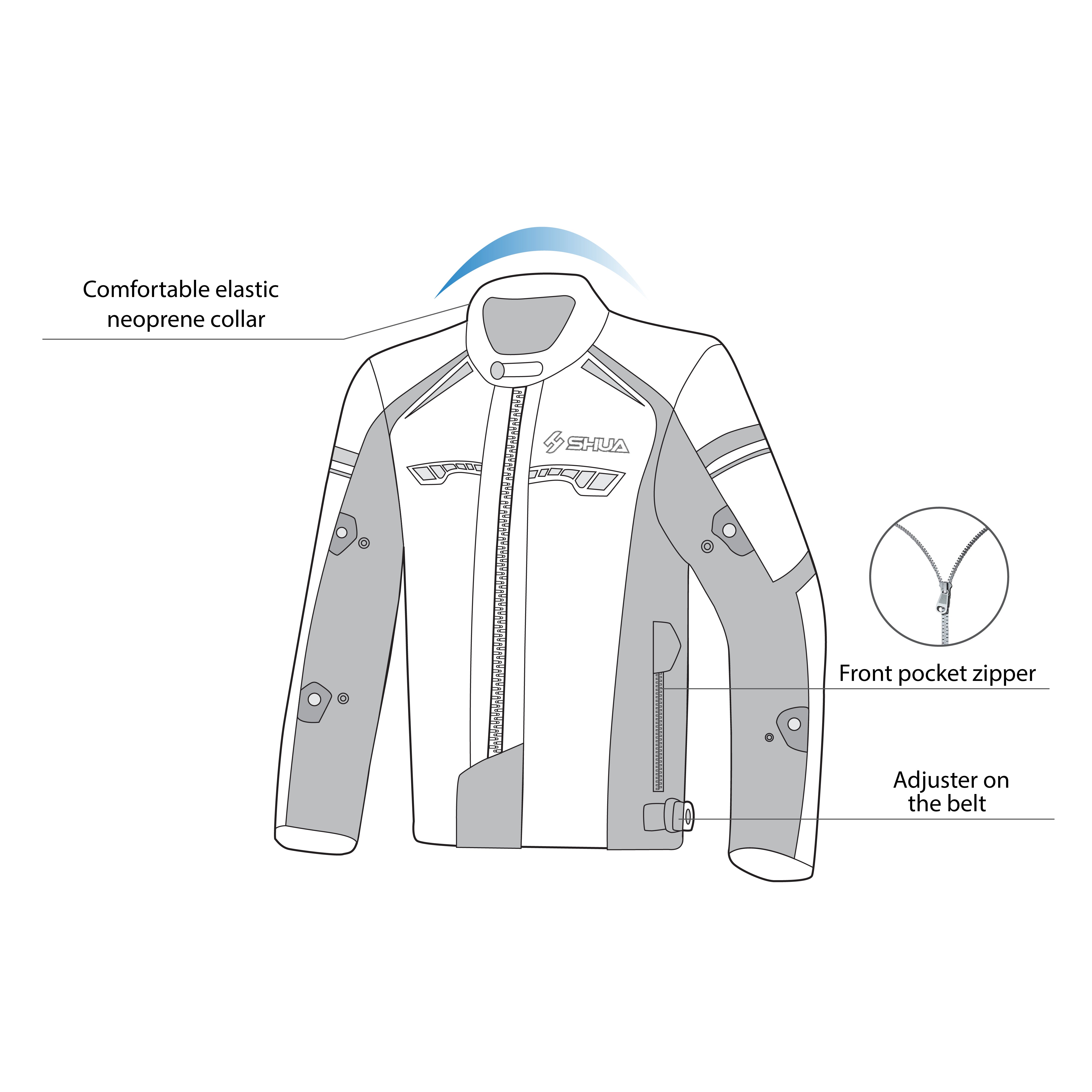 La giacca Shua Immortal è certificata secondo la norma EN 17092-4:2020 , con classificazione CE Classe A. Progettata per garantire sicurezza e durata, questa giacca presenta un morbido colletto in neoprene per un maggiore comfort a contatto con la pelle. La chiusura frontale con cerniera YKK e velcro garantisce una vestibilità sicura. Inoltre, è dotata di una cerniera di collegamento corta per agganciarla ai pantaloni da moto Shua e creare una tuta a due pezzi.