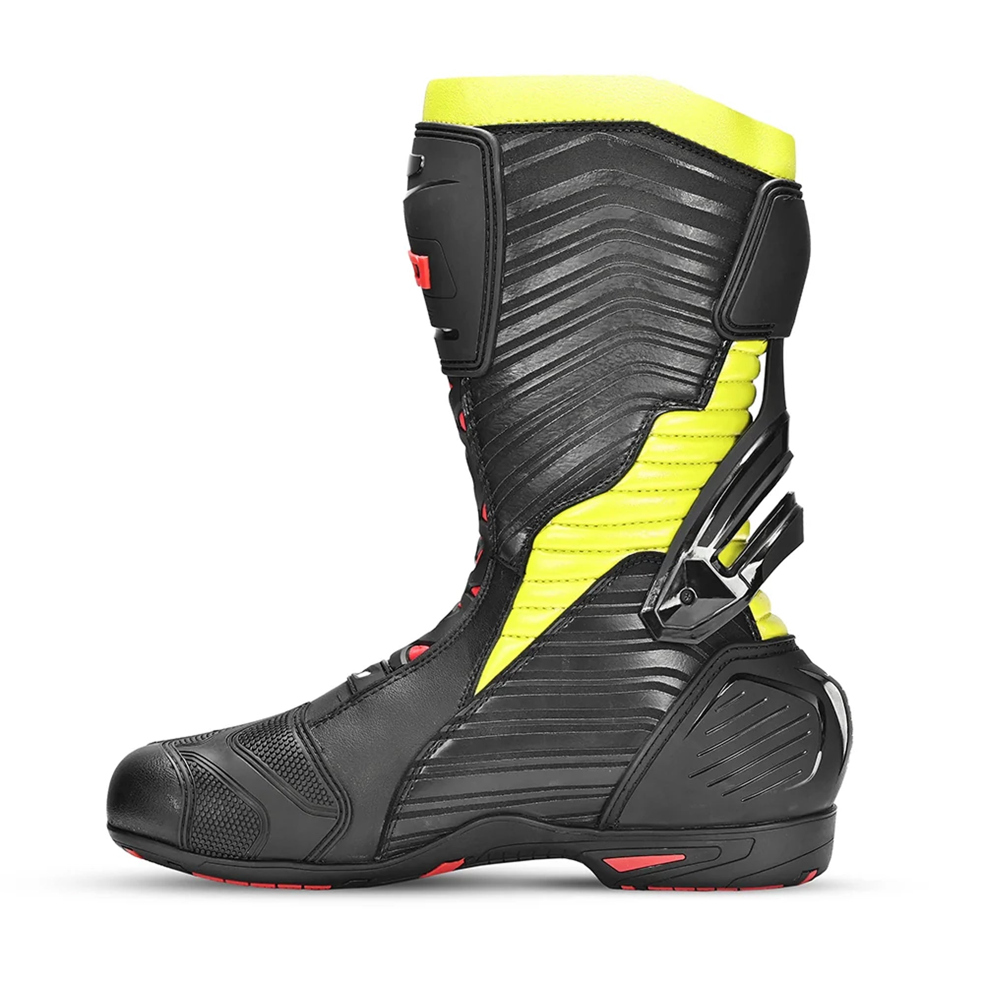 Resumen (TL;DR): Botas de motociclismo de competición de caña alta con certificación EN 13634:2017 IPA IPS, armadura completa y parte superior de microfibra en Negro/Gris/Amarillo Fluorescente, diseñadas para máxima protección y visibilidad en conducción deportiva.