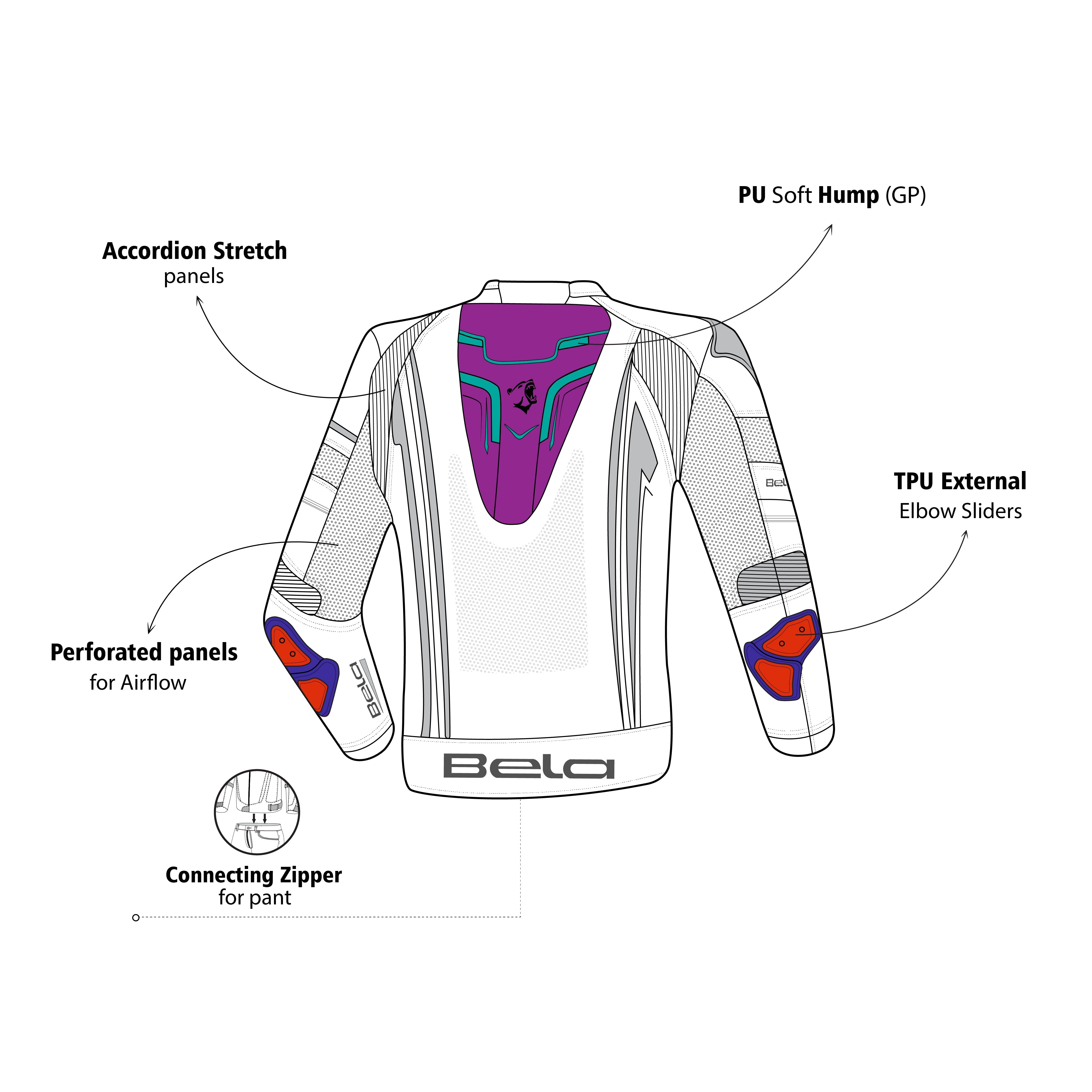 Fabricada en cuero bovino full-grain, esta chaqueta ofrece una resistencia superior a la abrasión y una protección fiable frente a impactos. Su diseño modular permite conectarla mediante cremallera a los pantalones Bela compatibles, creando un conjunto de dos piezas tipo racing suit.
