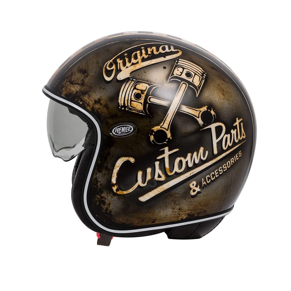 Casco de moto Premier Vintage Op 9 BM. Casco jet clásico y ergonómico fabricado en fibra de aramida con carbono Dyneema® y resina epoxi para una alta resistencia y ligereza, homologado según la norma ECE 22-06. El casco Premier cuenta con un visor solar interno fácil de desmontar. El acolchado interior es totalmente extraíble y lavable gracias a su sistema de liberación rápida micrométrica.