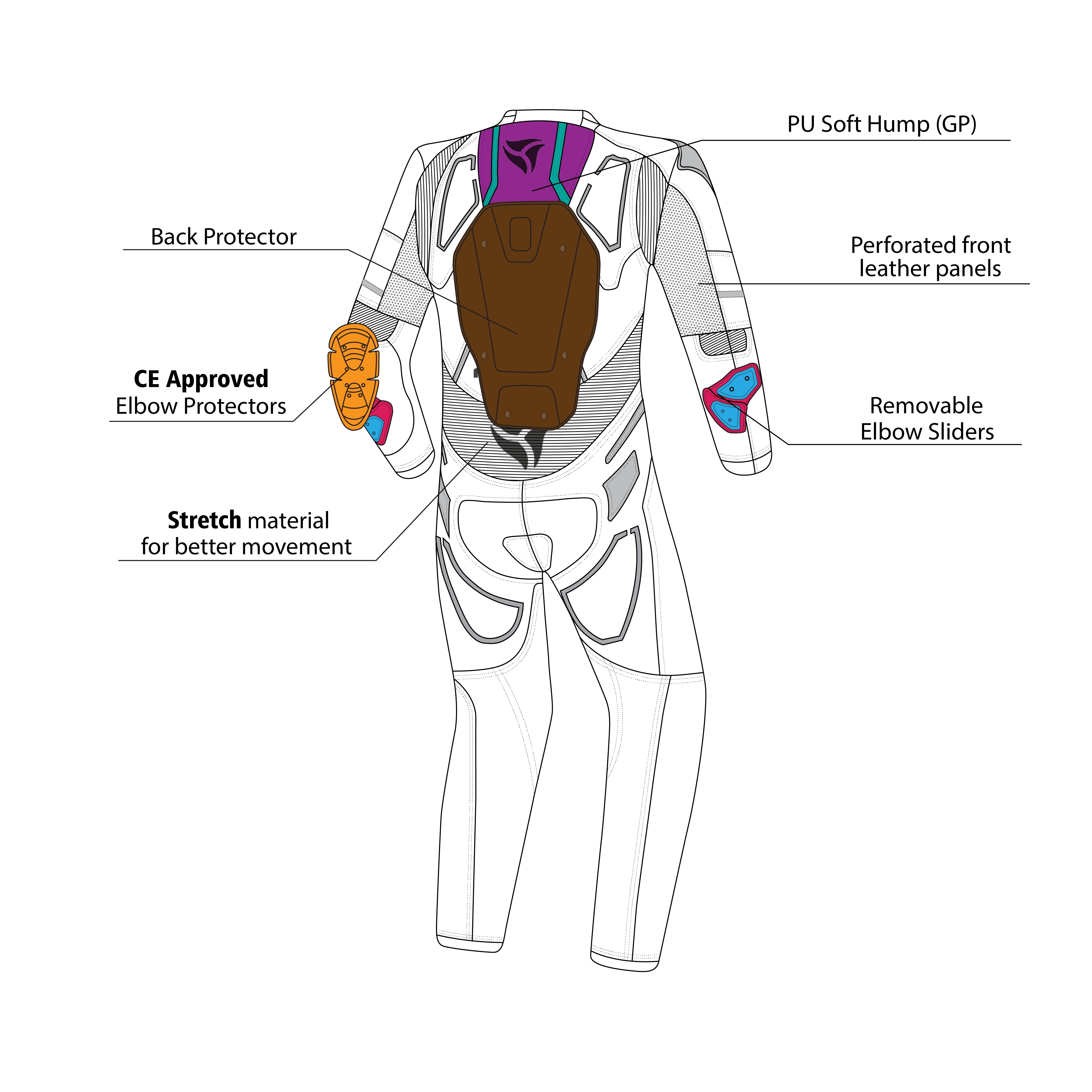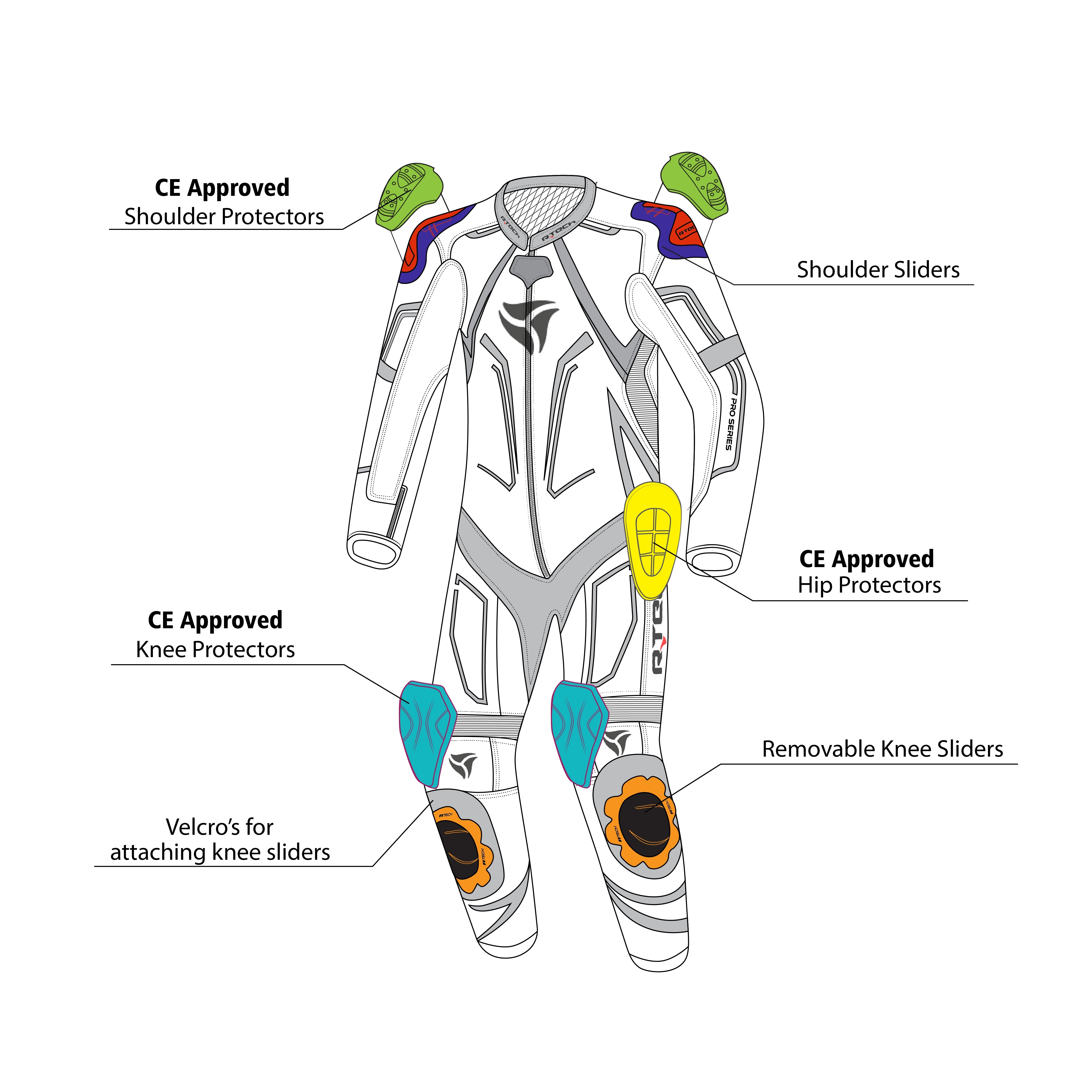 • Colocación avanzada de armadura: Equipado con protectores de rodillas, codos y hombros aprobados por la CE, junto con un resistente protector de espalda para una cobertura completa.