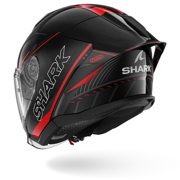 Su spoiler trasero característico, poco habitual en esta categoría, ofrece un control real del flujo de aire y líneas racing limpias que evocan los cascos vistos en la parrilla de salida.