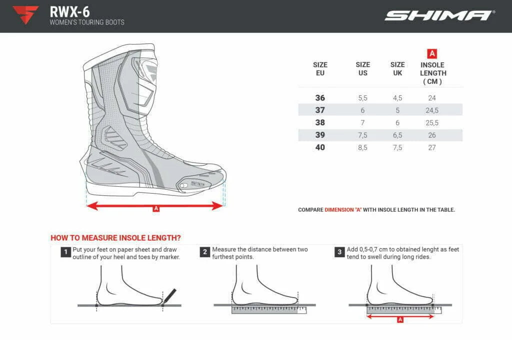 SHIMA RSX-6 representa botas esportivas para motociclistas meticulosamente elaboradas para se ajustar aos contornos dos pés femininos. O design ergonômico se alinha com a postura do piloto, enquanto um robusto revestimento de TPU cobre a superfície da canela. Um controle deslizante de metal na lateral da bota protege a lateral e a parte superior do pé, acompanhado de um reforço oculto sob a parte superior. Seções reforçadas nas regiões do calcanhar, tornozelo e dedos do pé, juntamente com uma almofada de mudança, proporcionam maior segurança e prolongam a longevidade das botas. O sistema SafeFoot reforça a sola verticalmente. O couro perfurado na frente e atrás permite ventilação e circulação de ar no interior da bota.
