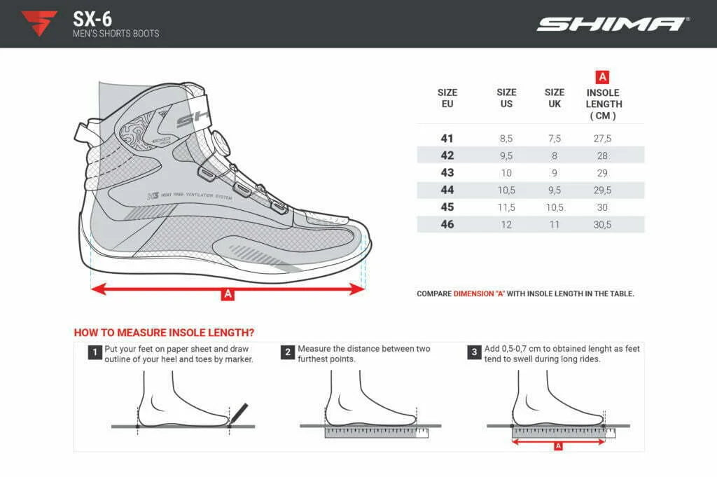 As botas curtas para motociclistas SHIMA SX-6 são uma excelente escolha tanto para pistas de corrida quanto para passeios urbanos. O calcanhar rígido reforça a parte traseira da bota e o controle deslizante de metal protege a lateral e a parte superior do pé, junto com um reforço escondido sob o couro. A sola do sistema SafeFoot é reforçada verticalmente. O couro perfurado na parte frontal permite leve ventilação e circulação de ar no interior do porta-malas. O SX-6 é equipado com uma alça que facilita a colocação no porta-malas.