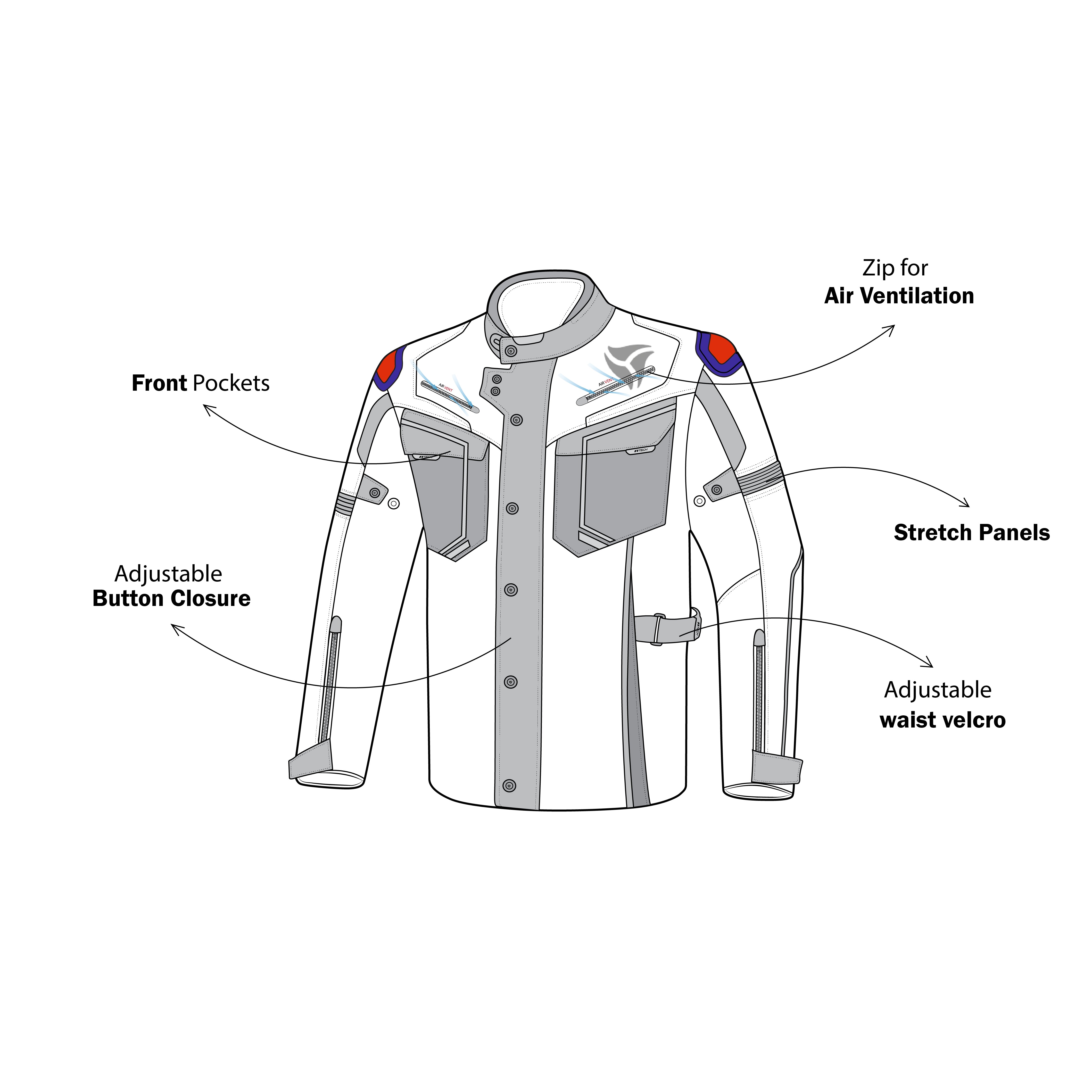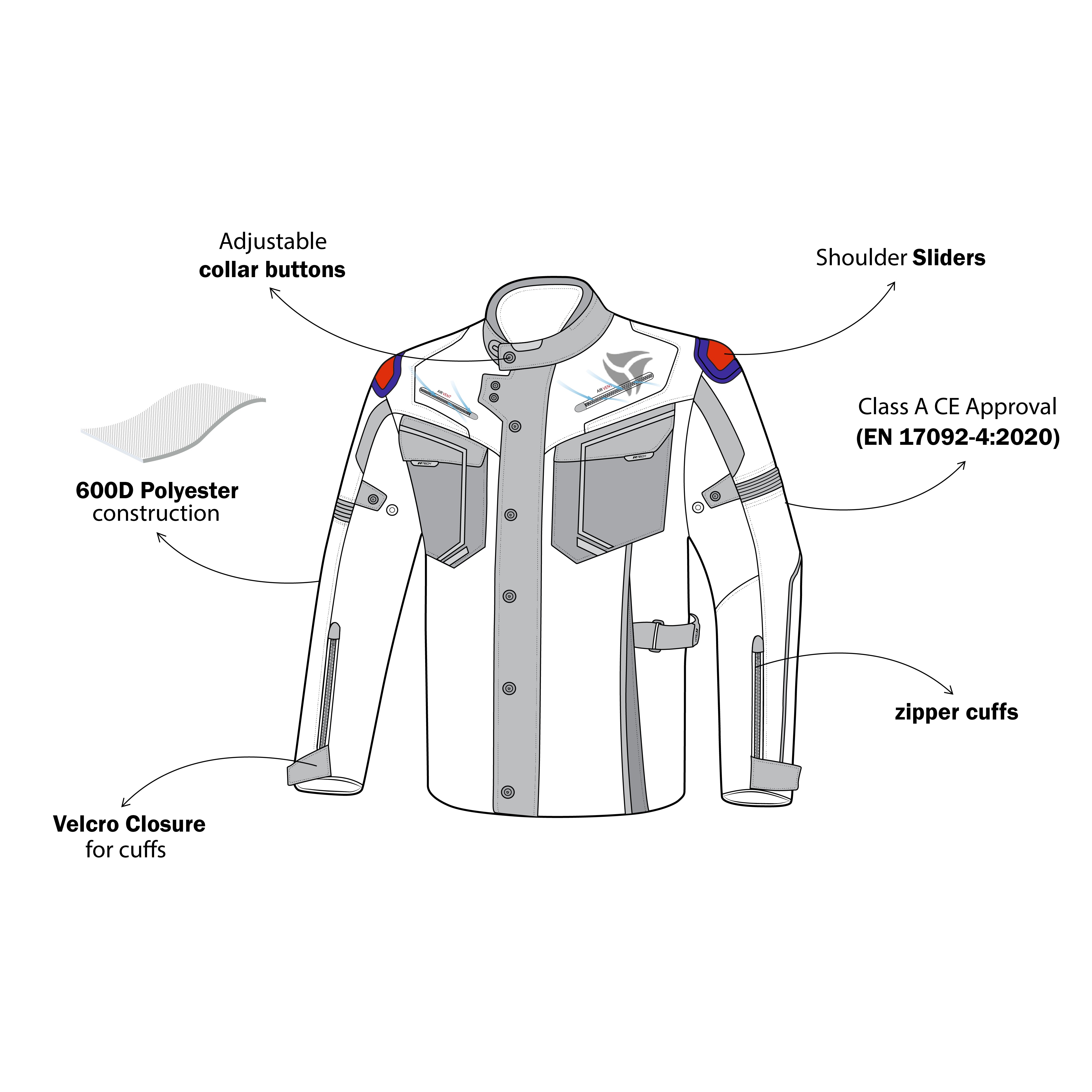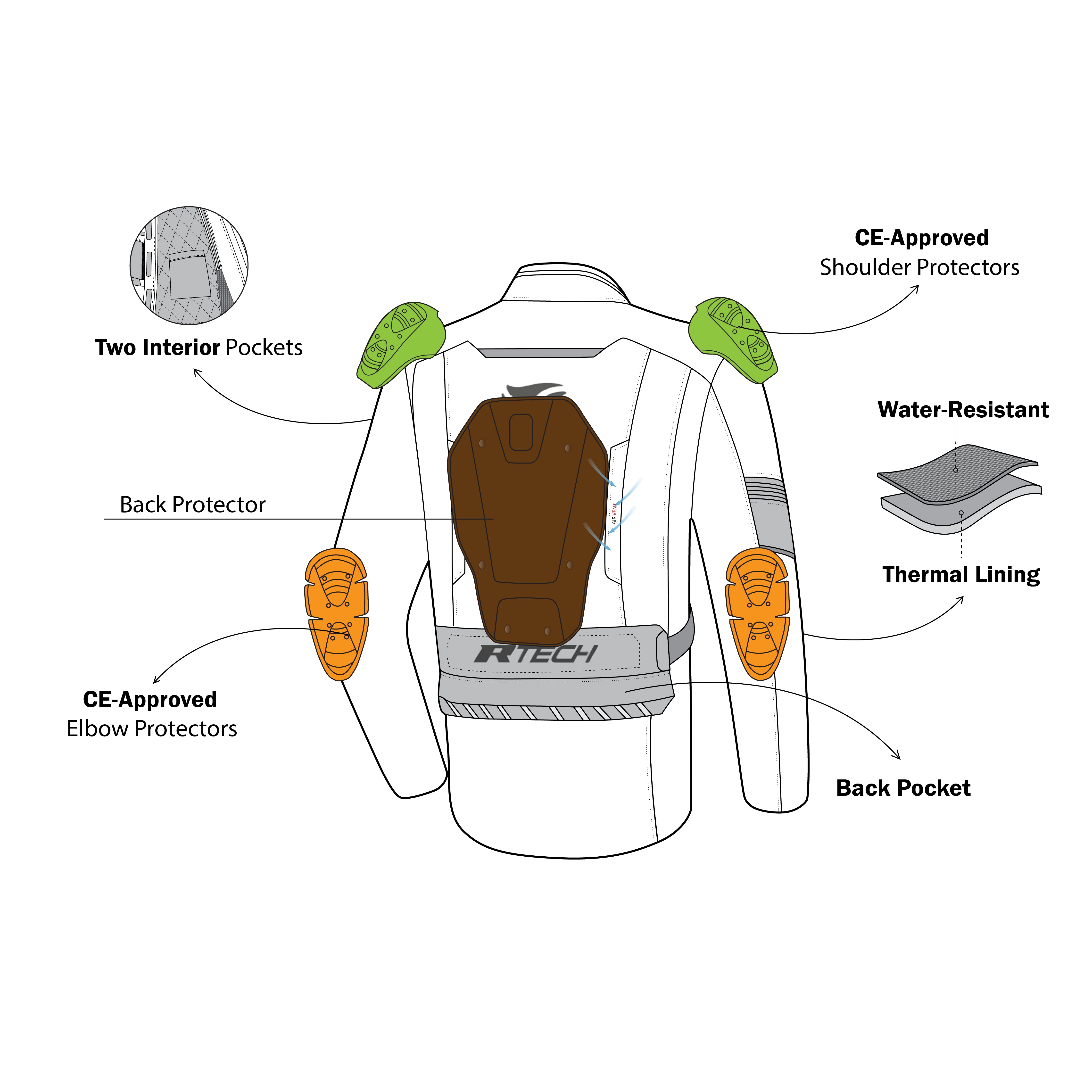 • Equipado com protetores de cotovelo e ombro certificados pela CE, juntamente com um protetor traseiro, para segurança abrangente.