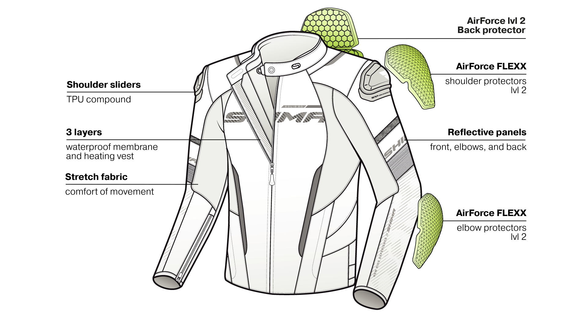 O casaco SOLID 2.0 foi concebido para oferecer proteção completa. Possui sliders externos nos ombros , reforços DuoLayer Protection nos ombros e cotovelos e protetores de costas SHIMA AirForce™ Nível 2. Os protetores de ombro e cotovelo FLEXX Nível 2 oferecem ajuste em duas posições , garantindo um encaixe perfeito e proteção eficaz contra qualquer impacto.